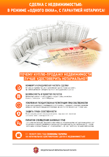 ФРПК продолжает разработку серии средств пропаганды нотариальных действий и преимуществ, которые дает гражданам обращение к нотариусу. Новый плакат «Сделка с недвижимостью в режиме „одного окна“ с гарантией нотариуса!» информирует граждан о том, что нотариус является не только надежным защитником их прав и законных интересов при оформлении сделок с недвижимостью, но и предоставляет высокий уровень комфорта при совершении сделки и ускоренную государственную регистрацию прав на недвижимое имущество.