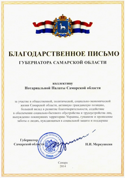 19 декабря 2014 года губернатор Самарской области Николай Иванович Меркушкин направил Благодарственное письмо в адрес самарских нотариусов.