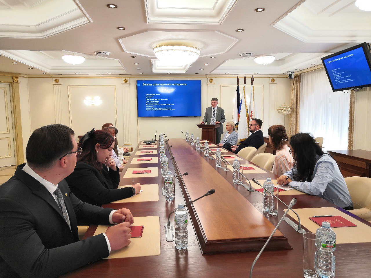 Закон предусматривает создание во всех субъектах РФ нотариальных палат — профессиональных объединений, которые основаны на обязательном членстве нотариусов и организуют работу на принципах самоуправления. Юрий Кашурин рассказал участникам мероприятия о деятельности нотариальных палат, их структуре, органах управления и др. Напомним, что за последние полгода были созданы четыре нотариальные палаты в новых субъектах Российской Федерации: ЛНР, ДНР, Запорожской и Херсонской областях. Всего в стране работает более 8 тысяч нотариусов. Количество должностей ограничено и утверждается федеральным органом юстиции совместно с ФНП из расчета количества населения на одного нотариуса.