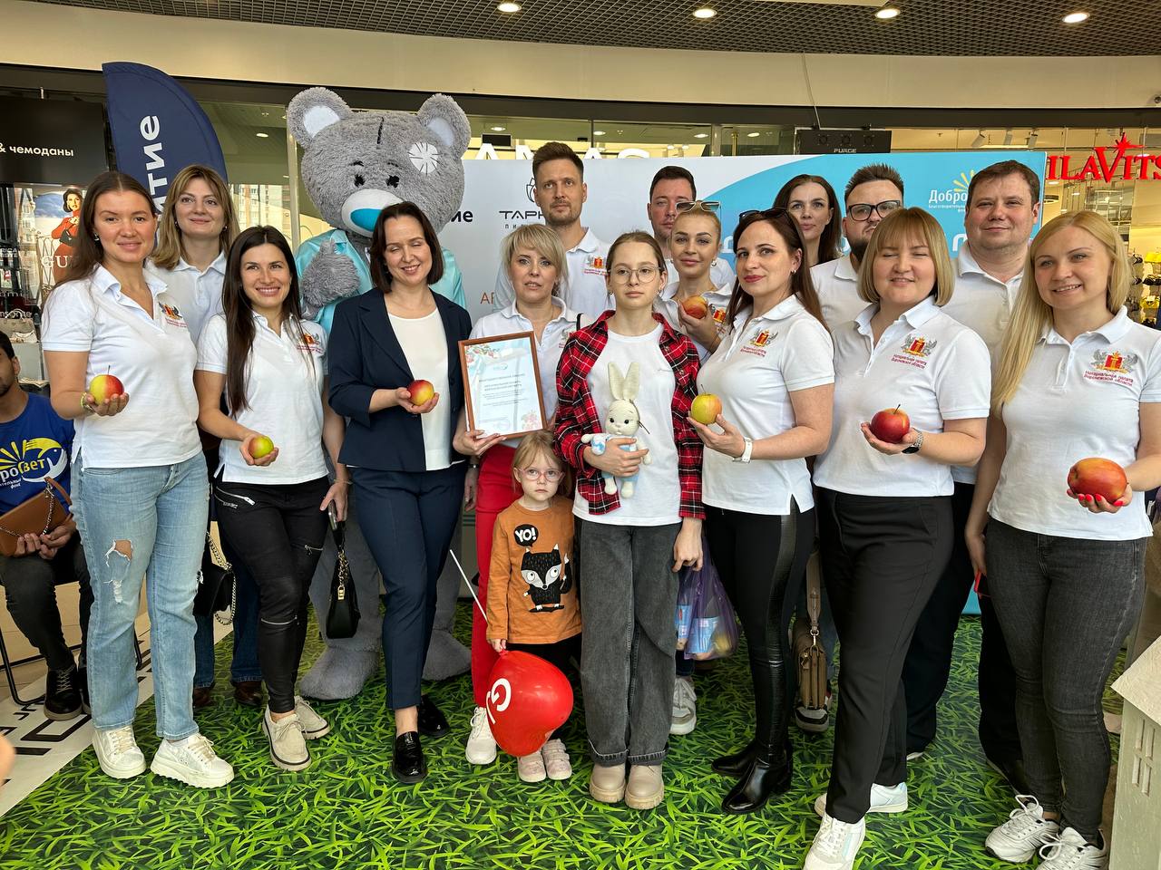 Наша дружная команда вместе с другими волонтерами приглашала посетителей торгового центра приобретать яблоки и творить добро, ведь все средства от реализации фруктов пойдут на борьбу со страшной болезнью.