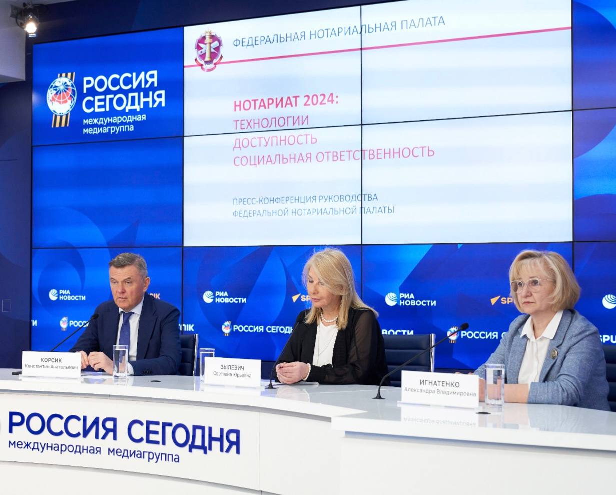 Важной темой пресс-конференции стало развитие цифрового нотариата, которому этим летом исполнится уже 10 лет. «Мы разработали и создали эту уникальную систему целиком и полностью по нашей инициативе и на средства нотариата, и все последующее развитие цифровых технологий в нотариате и во многом — в целом в правовой сфере, основано на ней», — отметил Константин Корсик.