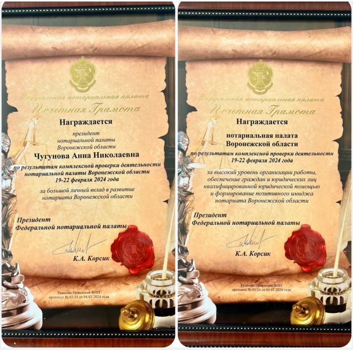 Президент Федеральной нотариальной палаты Константин Корсик вручил Анне Чугуновой, Президенту нотариальной палаты Воронежской области, Почетную грамоту по результатам комплексной проверки деятельности Нотариальной палаты Воронежской области и за большой личный вклад в развитие нотариата Воронежской области.