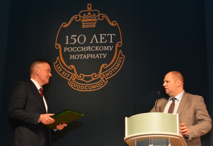 Награду президенту ФНП вручил статс-секретарь — заместитель министра юстиции РФ Юрий Любимов в ходе проведения торжественной церемонии, посвященной празднованию 150-летия нотариата России.
