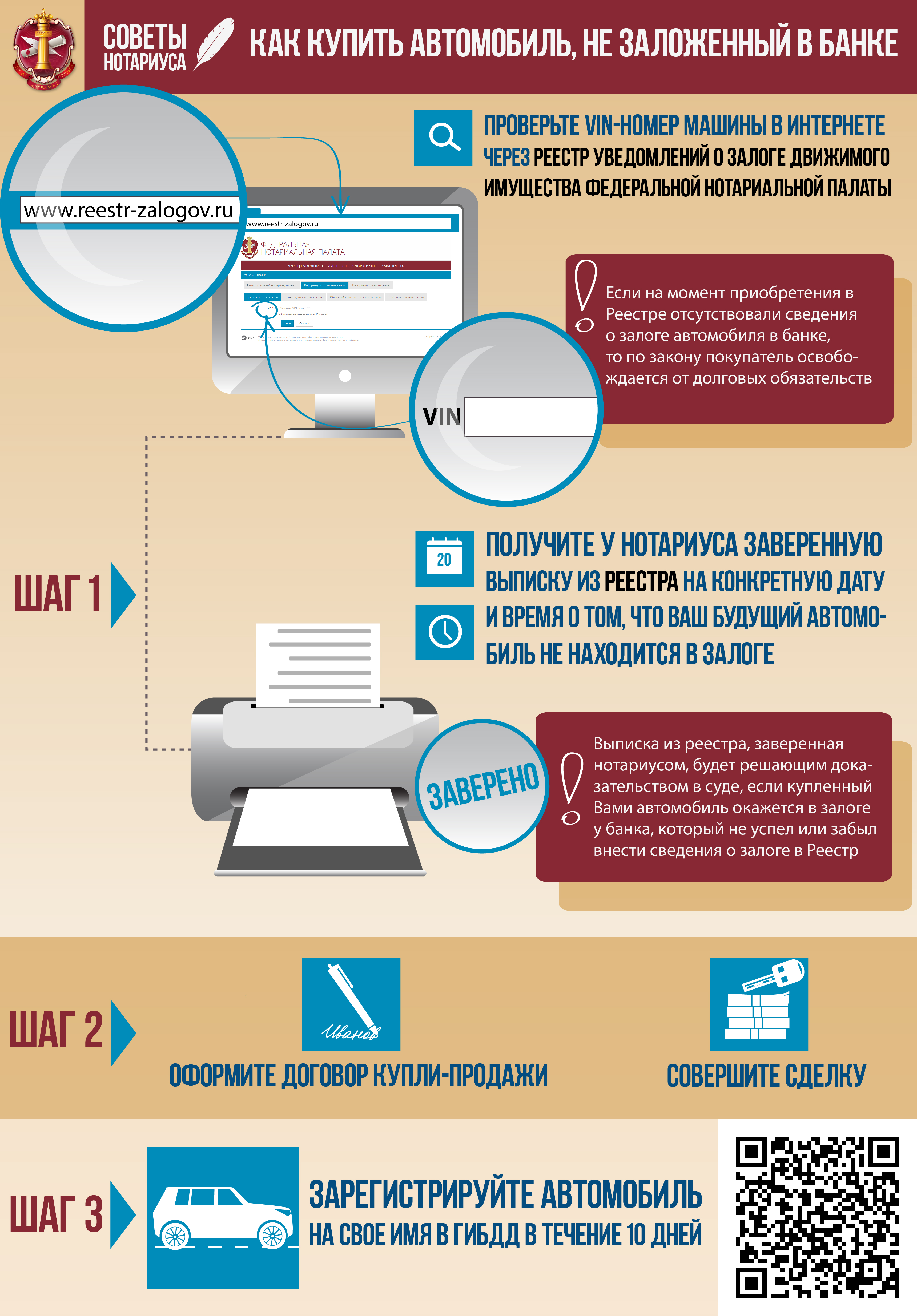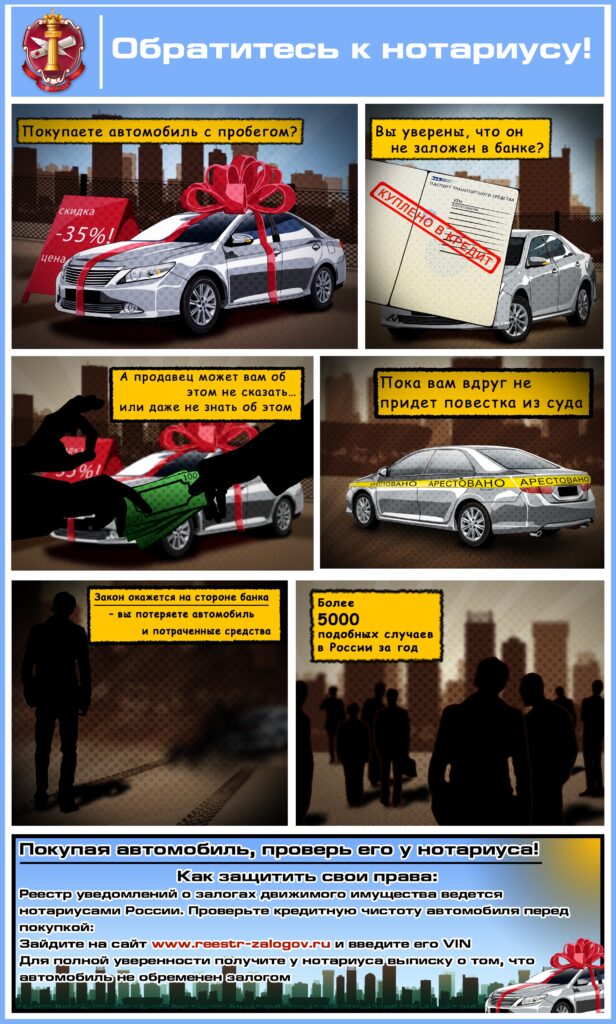 От приобретения заложенного автомобиля покупателя убережет проверка машины через этот реестр, который был создан Федеральной нотариальной палатой в соответствии с Федеральным законом № 379. Сейчас в нем уже зарегистрированы миллионы уведомлений. И это крупнейшая база объектов имущества, на которых «висят» долги. Вбив в реестре VIN автомобиля, вы сможете увидеть информацию о том, в залоге автомобиль или нет. И даже если по каким-то причинам сведений о залоге автомобиля, на самом деле купленного в кредит, там не оказалось (например, банк не предоставил их либо предоставил с опозданием), не беда. Согласно закону, если на момент приобретения покупатель не мог найти в реестре сведений о том, что имущество (автомобиль) были заложены, то он освобождается от обязательств — убытки понесет банк, который не внес в реестр сведения вовремя. Чтобы иметь «железные» доказательства, не потерять машину и не выплачивать чужие долги, в случае, если авто все-таки окажется в залоге у банка, нужно просто зайти к любому нотариусу, который выдаст выписку из реестра на конкретную дату и время о том, что такой-то автомобиль не находится в залоге. Тогда, даже если возникнет спорная ситуация, банк уже не сможет обязать вас платить чужой кредит. И машина тоже останется вашей. Услуга эта недорога — 40 рублей за каждую страницу выписки, плюс техническая работа, то есть сумма составит около 200-300 рублей.